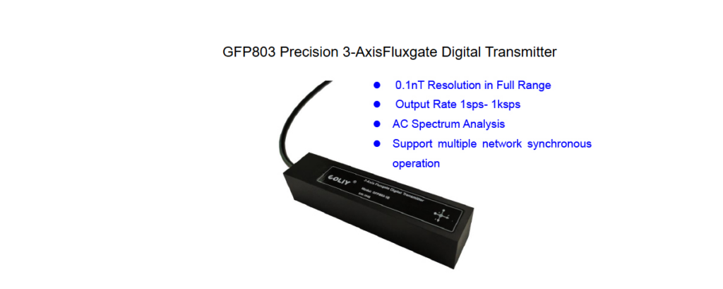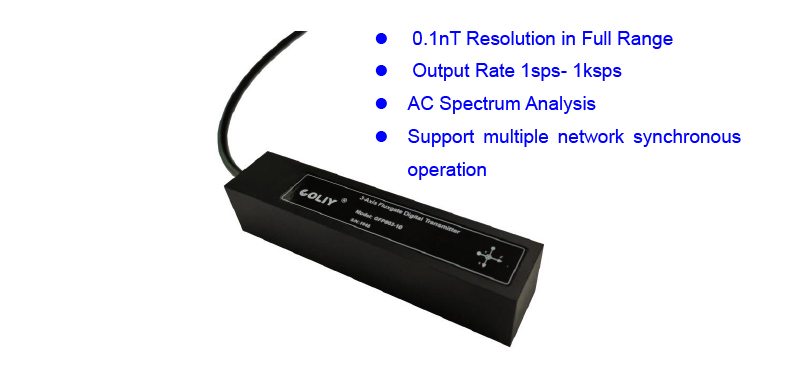 Three-Axis Fluxgate Digital Transmitter GFP803, which adopts 3 24-bit 32ksps ADCs with dynamic range up to 158dB, could make magnetic field density directly converted into 1-channel digital signal, and digital output (RS485) rate could be set between 1sps and 1ksps. Typical applications are that geomagnetism detection, underwater magnetic field monitoring, wrapped detection, traffic monitoring, measuring residual magnetism, low-intensity magnetic field measurement, laboratory, etc.